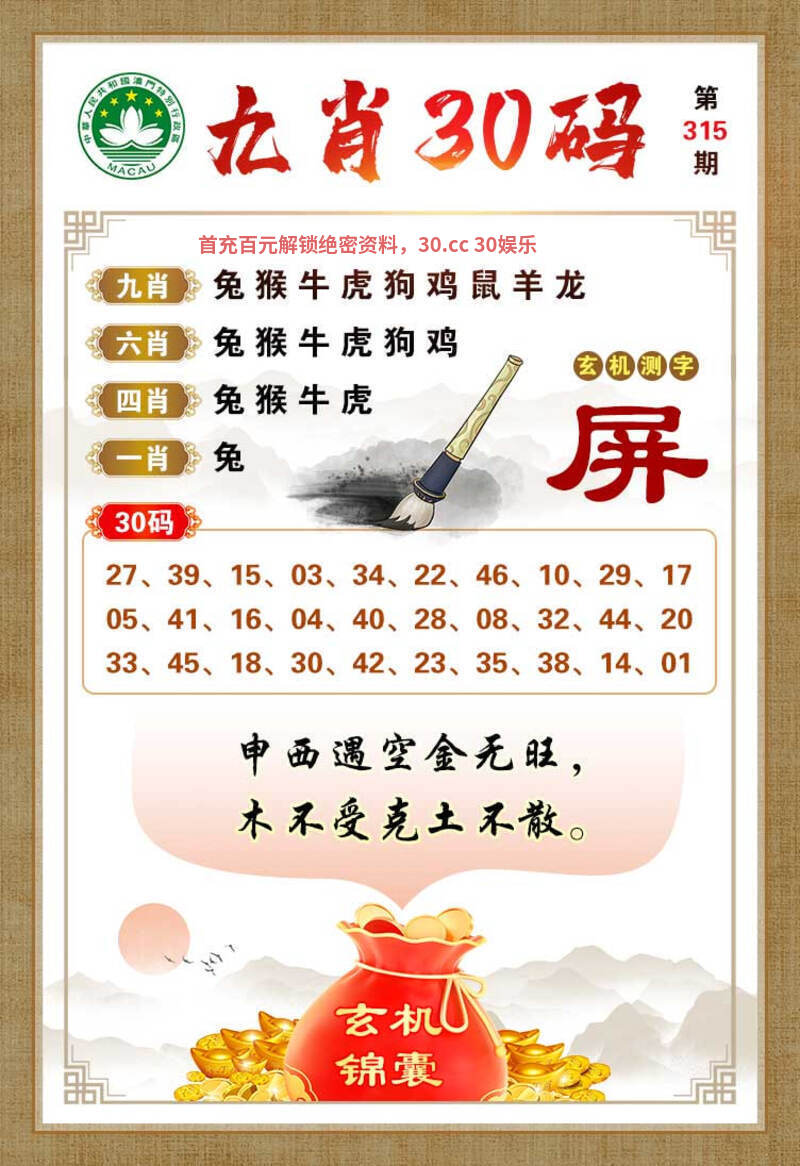 | 316期九码 | 49.12.30.16.05.33.02.46.15 | 开:發00 |
